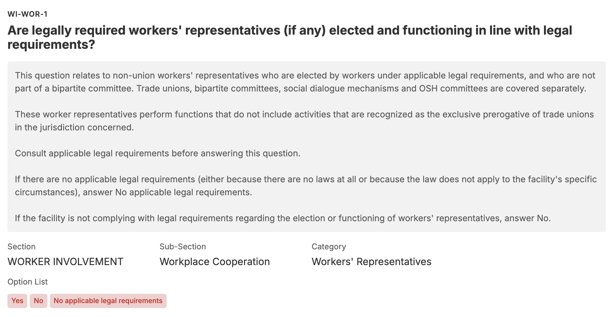 - Các lựa chọn trả lời: Danh sách các câu trả lời có thể bạn chọn (chẳng hạn như Có, Không, hoặc Không có yêu cầu pháp lý nào áp dụng).